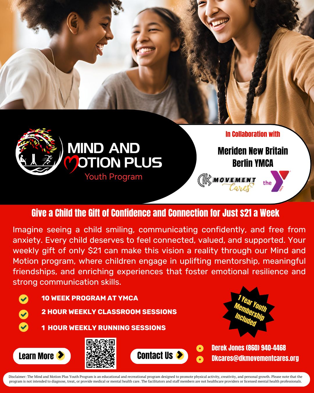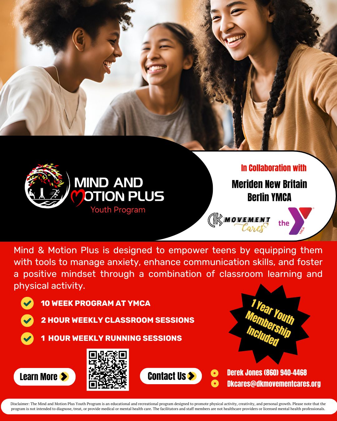 Thanks to the belief and support of from the Meriden New Britain Berlin YMCA, this program is set to launch spring 2026 and they we’re able to offer our program inside their facilities, giving participants access to a safe, welcoming space and the bonus of a one-year YMCA youth membership, at no additional cost to them. This collaboration doesn’t change who we are, Mind and Motion Plus is a community-powered program designed and led by us. The YMCA simply saw our vision and chose to stand with us.